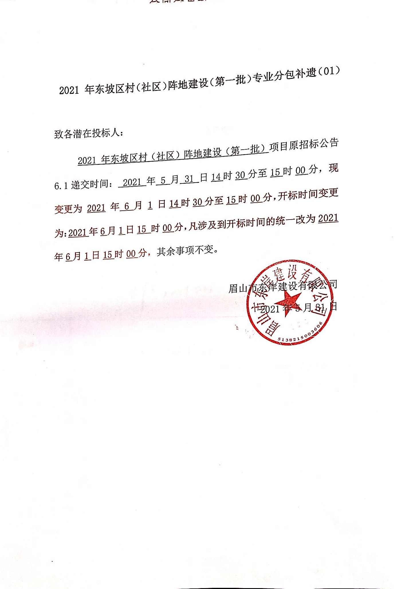 2021 年東坡區(qū)村(社區(qū))陣地建設(shè)(第一批)項目原招標公告6.1遞交時間: 2021 年5月31日14時30分至15時00分,現(xiàn)變更為2021年 6 月1日14時30分至15時00分,開標時間變更為:2021年6月1日15時00分,凡涉及到開標時間的統(tǒng)一改為2021年6月1日15時00分,其余事項不變。
