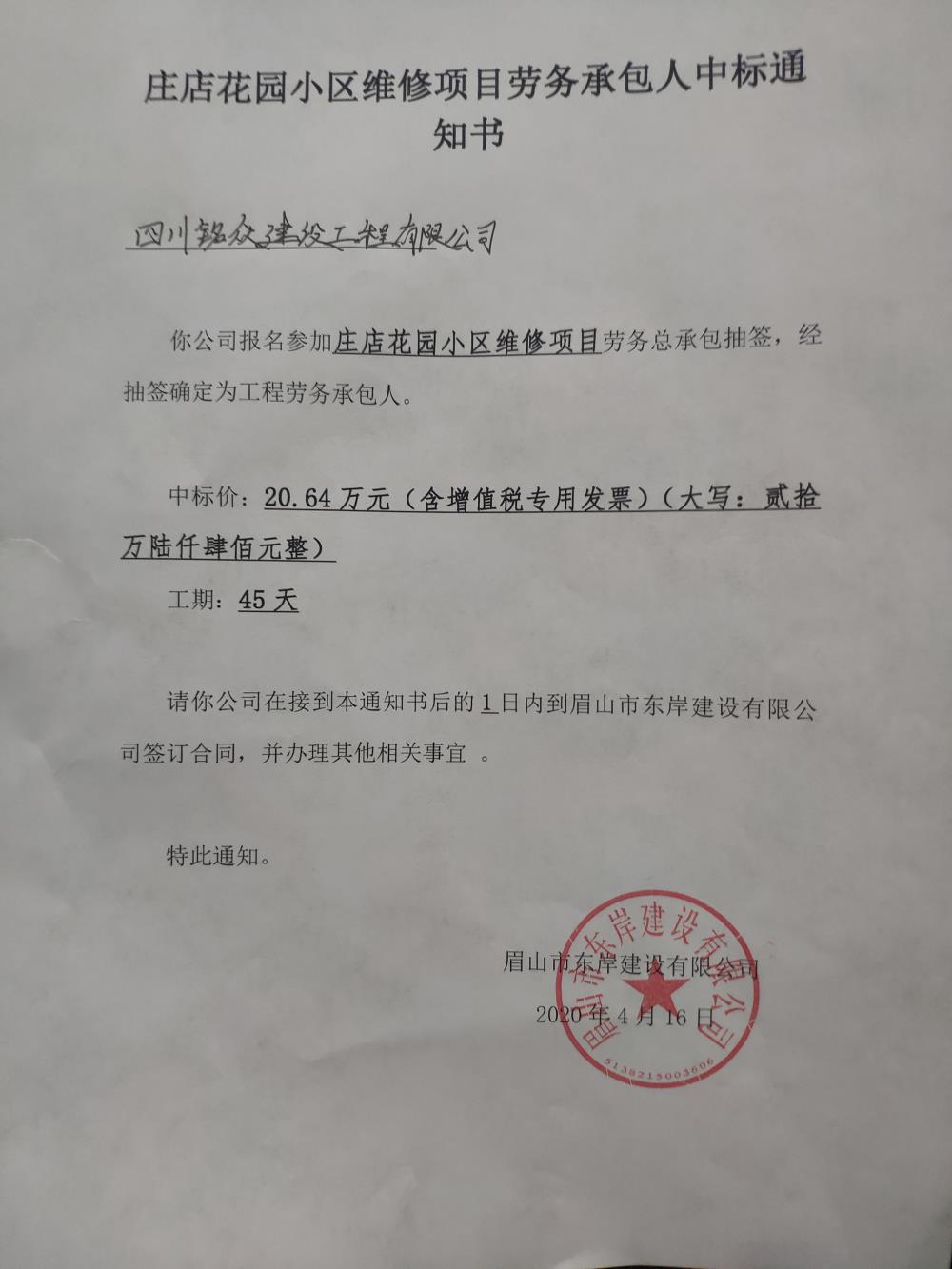 莊店花園小區(qū)維修項(xiàng)目中標(biāo)通知