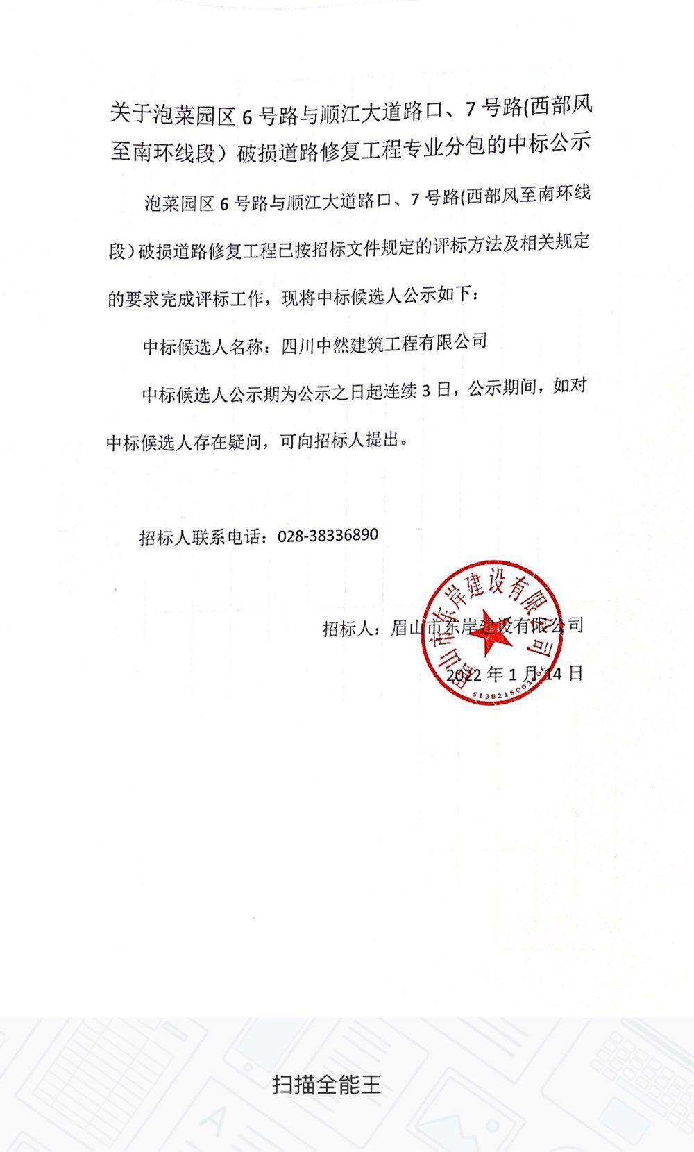 關(guān)于泡菜園區(qū)6號路與順江大道路口、7號路(西部風(fēng)至南環(huán)線段)破損道路修復(fù)工程專業(yè)分包的中標(biāo)公示