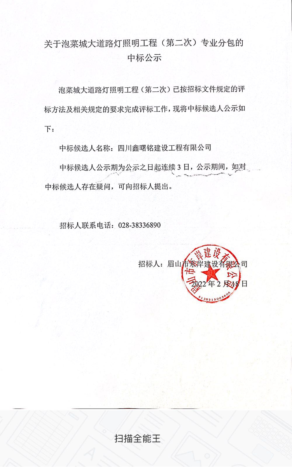 關(guān)于泡菜城大道路燈照明工程(第二次)專業(yè)分包的中標(biāo)公示
